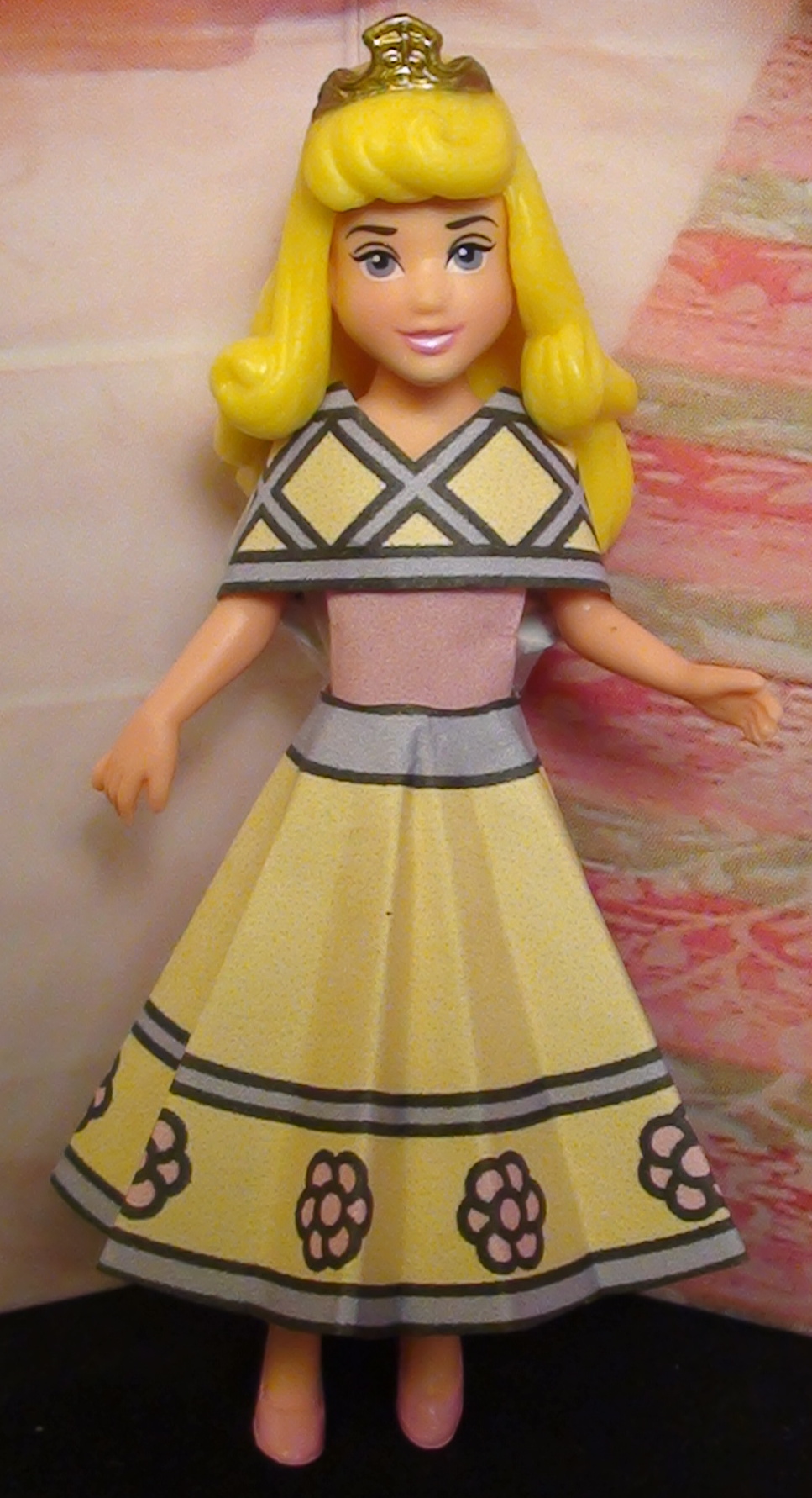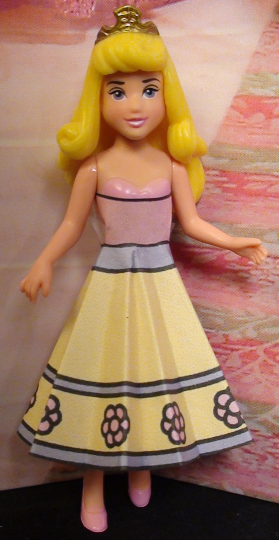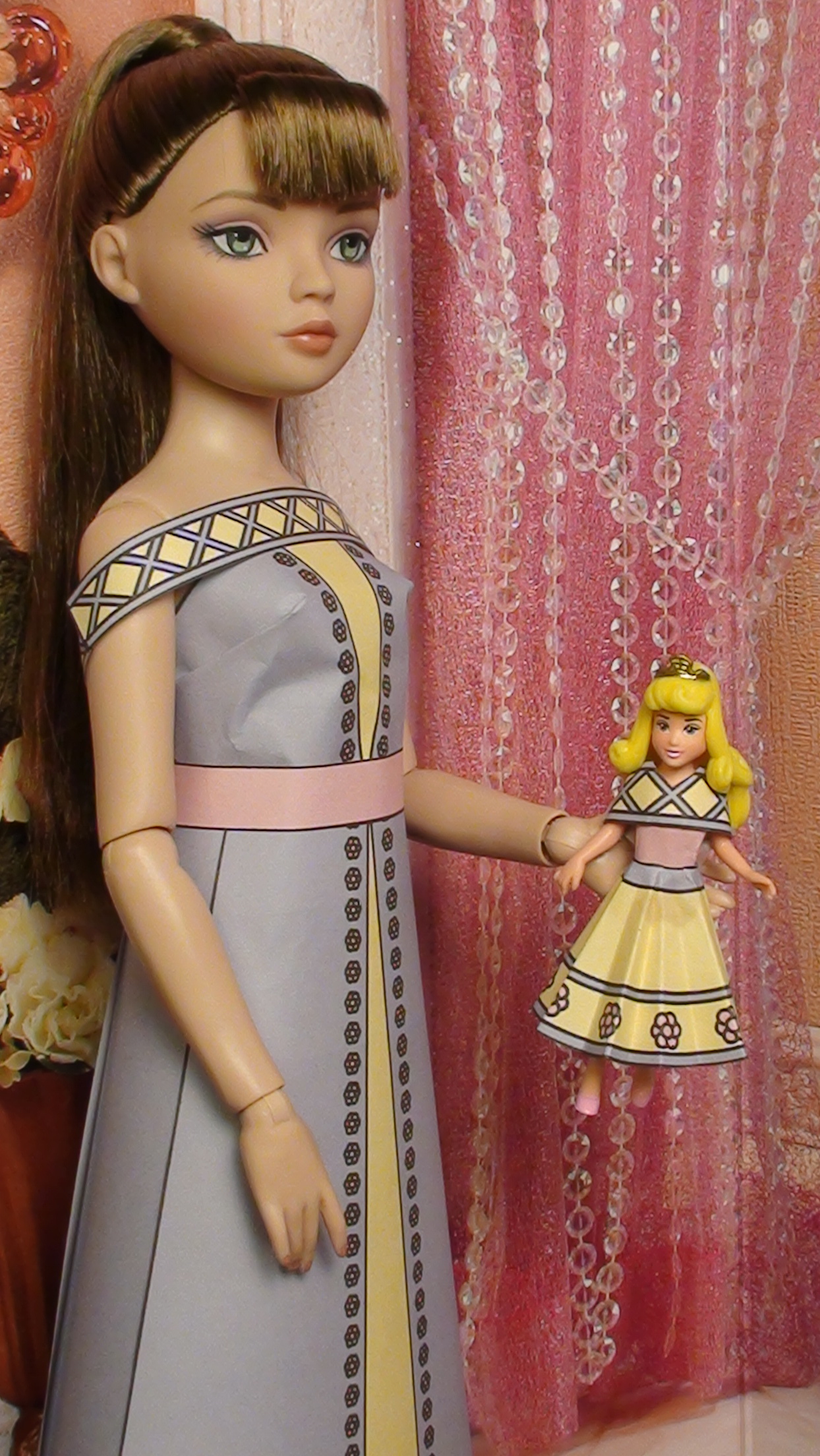 I used five pieces of the flared skirt with train, just the back piece with the train, and taped them together as shown in the picture. I wrapped the skirt around the doll’s waist, overlapped the edges in the back and taped it in place.