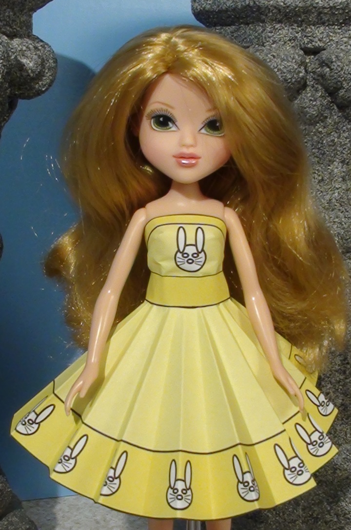 Snuggly wrap the belt around the doll’s waist and separately tape both ends to the back of the dress. This will hold the belt in place more securely.
