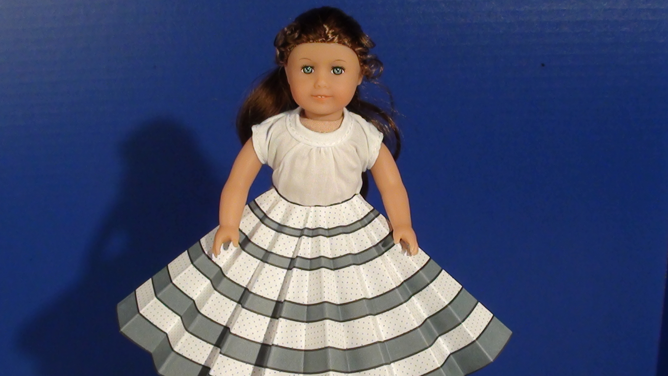 Put the top back on the doll and wrap around. The top should now be high enough and have room for her arms. You may need to try the top on the doll a couple of times to get the fit right. Once you are happy with the fit, tape the overlap of the top in the back