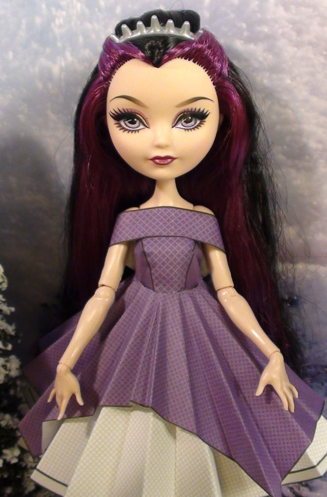 Raven Queen has a straight skirt over skirt and a wrap around collar.